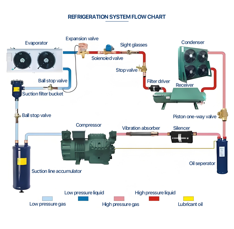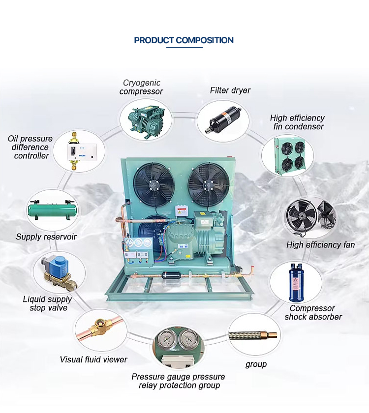 key Components | 1. Compressor 2.Hydrophilic aluminium Condenser 3. Oil heating 4. Liquid receiver 5. Filter 6. Sight glasses 7. Solenoid valve 8.H/L P gauge 9. mechanical Pressure controller 10. Oill pressure protection 11. Vibration eliminator 12. Oil separator 13. Gas separator 14. Suction filter |