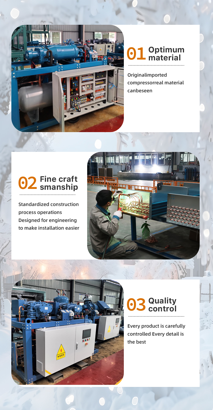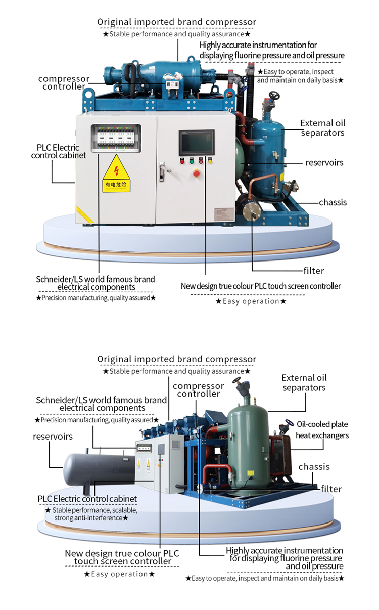 A high-performance refrigeration system designed for large-scale cooling needs. Equipped with advanced screw compressor technology and efficient heat transfer components, it delivers stable cooling capacity. Ideal for commercial centers, industrial plants, data centers, and as a cold source for central air-conditioning or industrial production cooling.